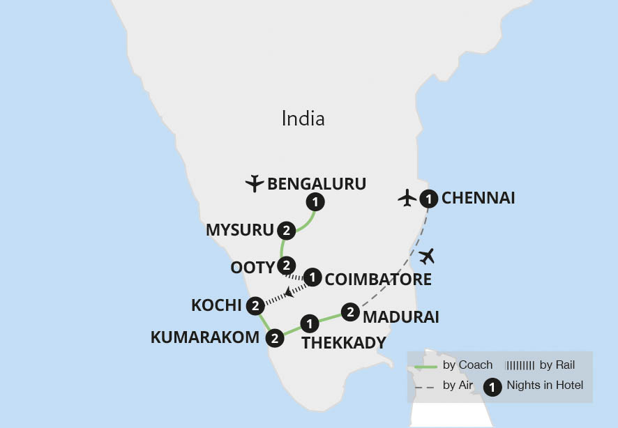This unforgettable tour of colourful southern India explores exciting cities, stunning Hindu temples, atmospheric mountain plantations and tranquil backwaters. After a night in Bengaluru, we soak up Mysuru's awe-inspiring royal palace and the charms of botanic Ooty before the tea plantations of Coonoor on the Nilgiri Mountain Railway. ...