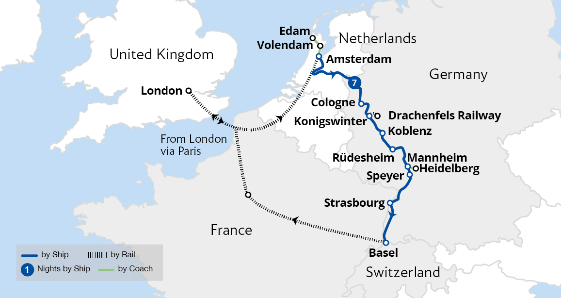 This beautifully scenic, relaxing cruise takes us to the towns and cities of the River Rhine. Sailing by enchanting landscapes, discover the landmarks of Cologne and enjoy a ride aboard the charming Drachenfels cog railway. Admire the Roman fortifications of Koblenz and Boppard before cruising through the sensational vistas of the UNESCO-listed...