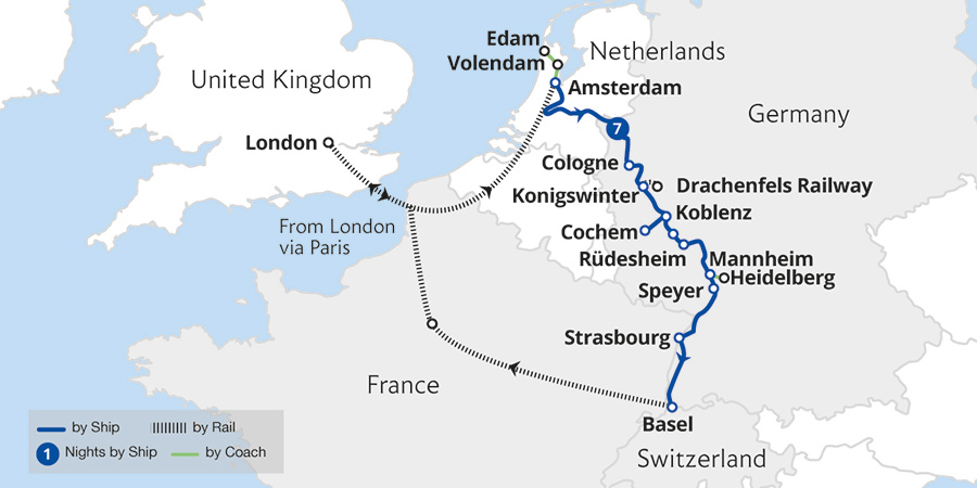 This beautifully scenic, easy-paced cruise takes us to the towns and cities of the River Rhine. Sailing by enchanting landscapes, discover Heidelberg and Strasbourg along with the sensational vistas of the UNESCO-listed Rhine Gorge. From Cologne, we sail south to explore the town of Koblenz, enjoy a guided tour of Heidelberg, and wander...