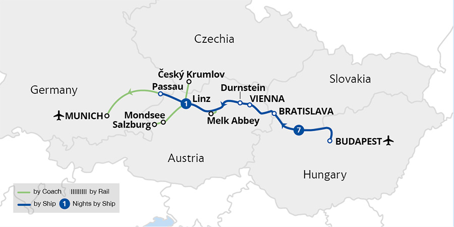 Fly to and from Munich to enjoy a leisurely cruise through four countries and three capital cities, basking in beautiful river scenery all the way. Sail from the German border town of Passau through the Austrian wine-growing region of the Wachau Valley, admiring picturesque Dürnstein and commanding Melk Abbey enroute. After exploring ...