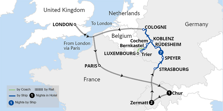 • Switzerland: Discover where the Rhine begins with visits to cloud-kissing Chur, Switzerland's oldest village, and Zermatt, a picture-perfect, car-free mountain village. No trip to the mountainous regions is complete without a ride on the world-famous Glacier Express or Gornergrat Mountain Railway with its views of the Matterhorn.