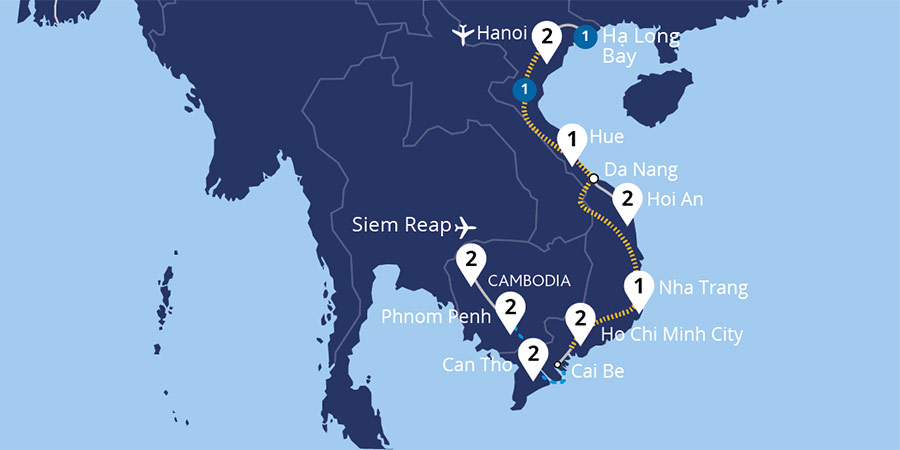 Discover the delights of Vietnam and Cambodia on this incredible grand tour, travelling overland from bustling Hanoi to the ancient temples of Siem Reap. Delight in the beauty of Ha Long Bay on an overnight cruise, and ride in a Violette cabin aboard the Reunification Express train along Vietnam's coast, visiting regal Hue and pretty Hoi An...