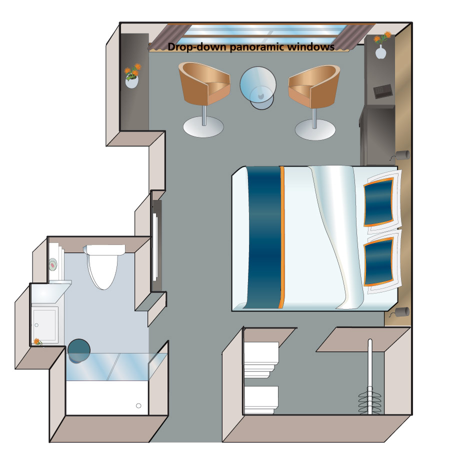 These en-suite cabins are stylish and impressively spacious at 17.5 squre metres, with a panoramic window balcony, walk-in wardrobe and seating area.