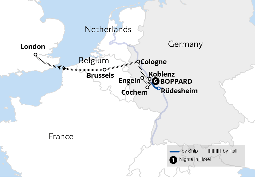 Arriving in Cologne, we travel by coach along the scenic Rhine Valley to the riverside town of Boppard. Located on a bend in the Rhine and with great transport connections, Boppard is a popular base for explorations of this beautiful region. Arriving in early evening, our hotel is opposite the train station and boasts a garden terrace overlooking the Rhine. After checking in, we enjoy a welcome drink before our first dinner together.