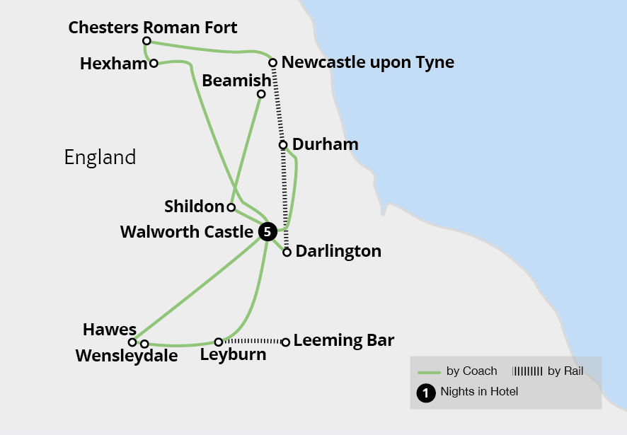 Discover some of the region's most famous landmarks, such as Chesters Roman Fort and Hadrian's Wall, and step back in time to other historic periods during visits to the captivating Beamish Museum and Hexham's 12th-century abbey. Explore the birthplace of the world's railways at the Locomotion museum in Shildon and enjoy the tranquil scenery of the countryside while relaxing in historic Northern England.