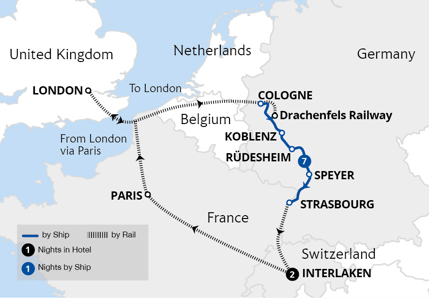 Combine an iconic rail trip on the Jungfrau Railway to the 'Top of Europe' from the alpine resort town of Interlaken with a 7-night luxury cruise through the glorious Moselle and Rhine. From Interlaken's stunning lake and mountain setting, we board the MS Amadeus Cara, and cruise two of Europe's celebrated rivers - the meandering Moselle...
